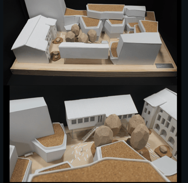 El diseño del jardín incluye una vegetación exuberante con árboles tallados en espuma de poliestireno para darles textura y volumen. El césped se ha creado con cortes de corcho y fórex, y se han representado jardineras utilizando la misma técnica. La combinación de formas angulosas y marcadas en la espuma de poliestireno crea un aspecto realista para los árboles, mientras que el corcho y fórex aportan un toque natural al césped. El resultado es un jardín con una vegetación variada y detallada que añade belleza y frescura al entorno.